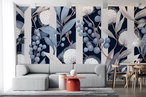 Fototapet Blomsterprydnad med vilda bär, vintage, blå och grå färger Nr. w01886