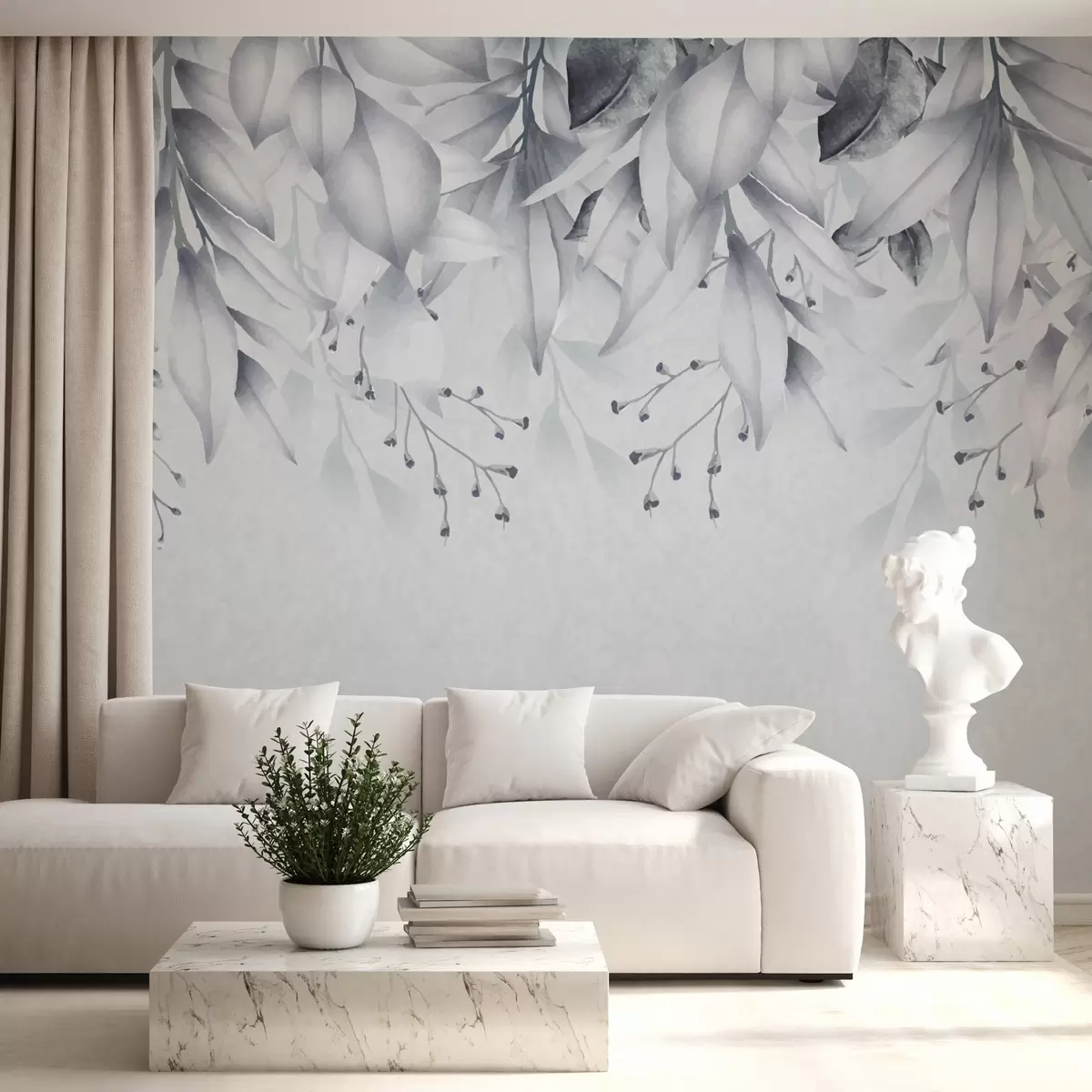 Fototapet Blå löv och kvistar hänger ner från ovan Nr. w01927v2