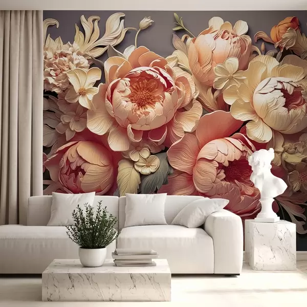 Fototapet Ett 3D-blomarrangemang med rosa-beige pioner och rokokorosor mot en mörk bakgrund Nr. w01933