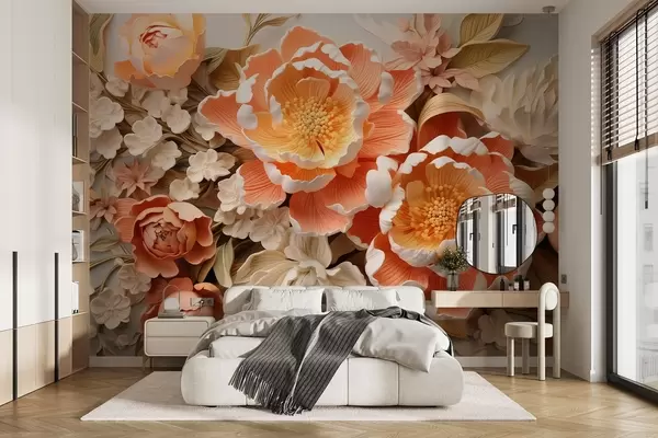 Fototapet Ett 3D-blomarrangemang i persikofärgade toner med pioner och rosor i rokokostil Nr. w01939