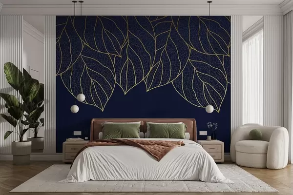Fototapet Minimalistisk tapet med silhuetter av stora gula blad med ådror på en blå bakgrund Nr. w01960v3