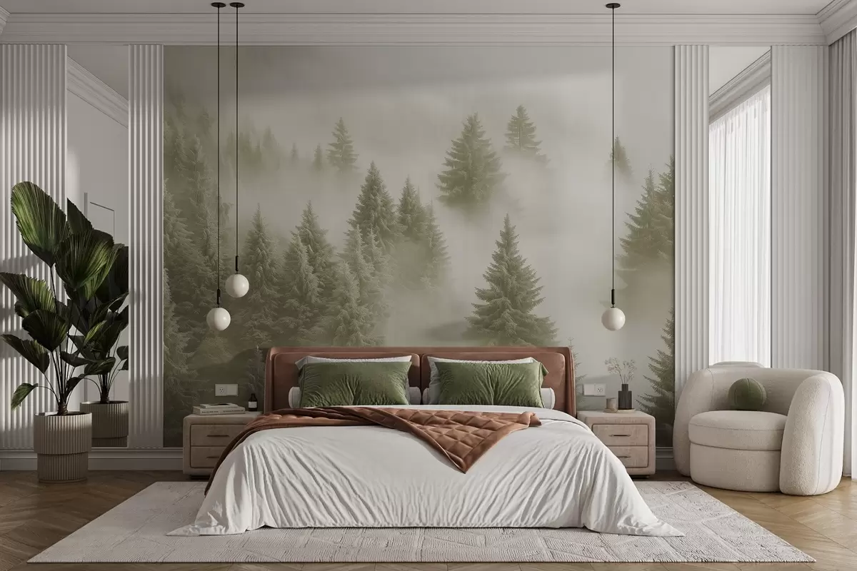 Fototapet Tjock dimma omsluter en snöig morgonskog i mjuka gröna nyanser Nr. w02064v2