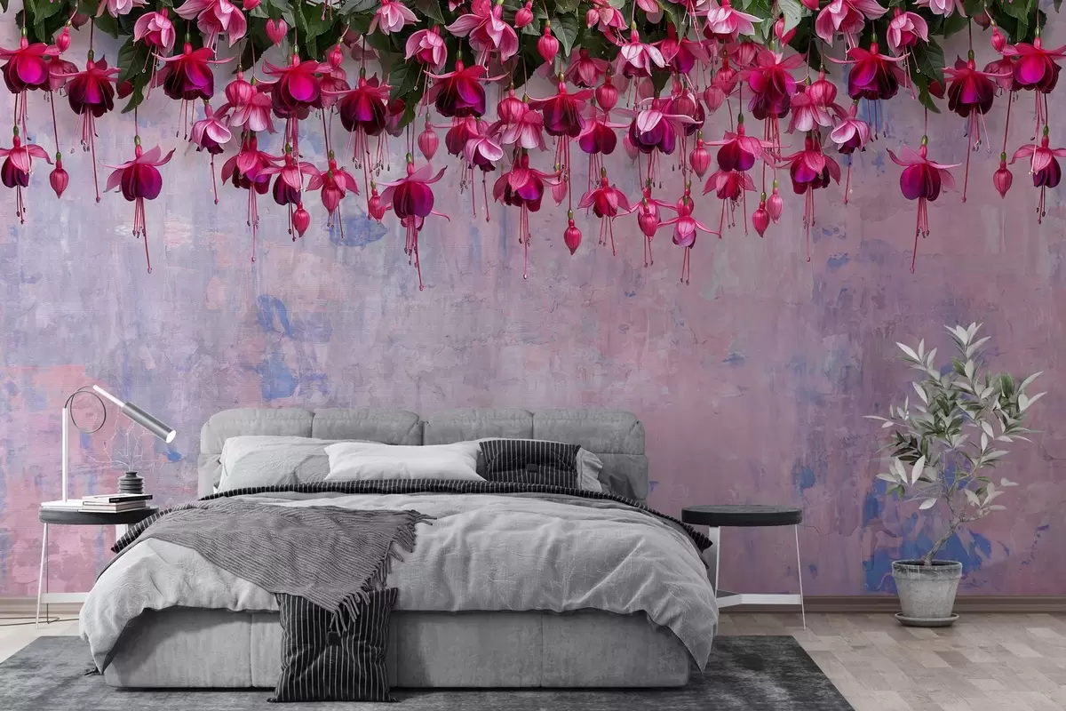 Fototapet Stora fuchsiablommor som hänger ovanifrån på bakgrunden av en retrovägg med imitation av skrapmärken Nr. w02132