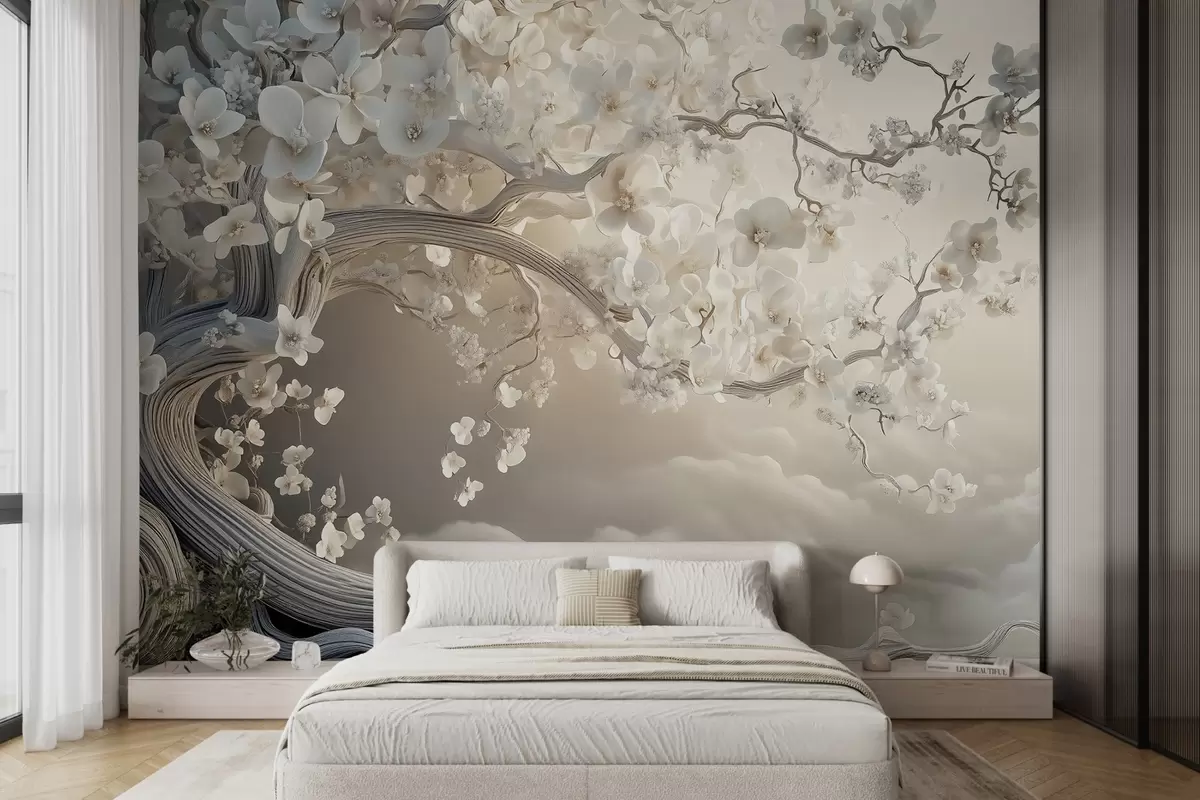 Fototapet Ett charmigt träd med vita blommor mot en bakgrund av moln i en intressant stil i delikata varma färger Nr. w02133