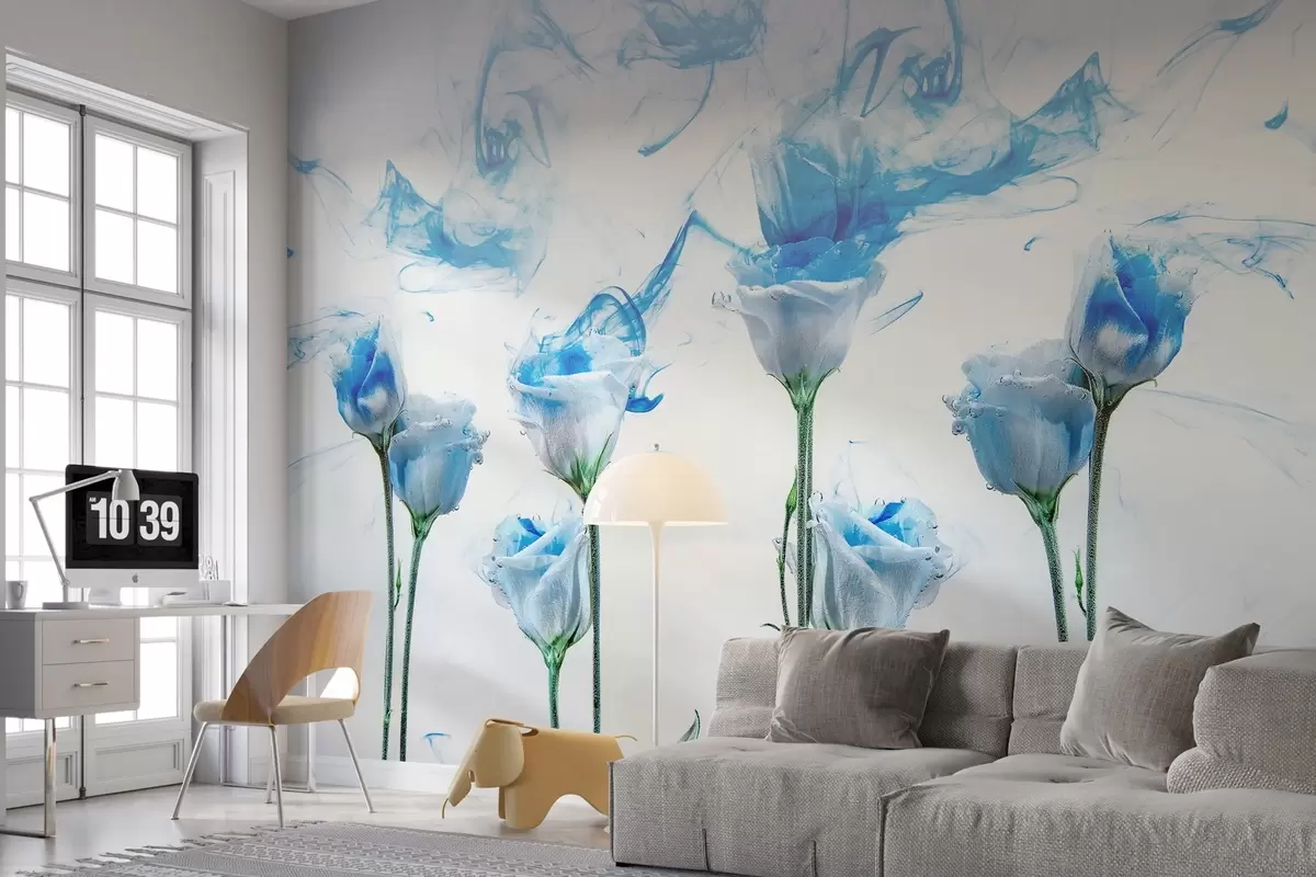Fototapet Vita rosor under vattnet på en vit bakgrund med blå akrylfärgsränder. Nr. w02139