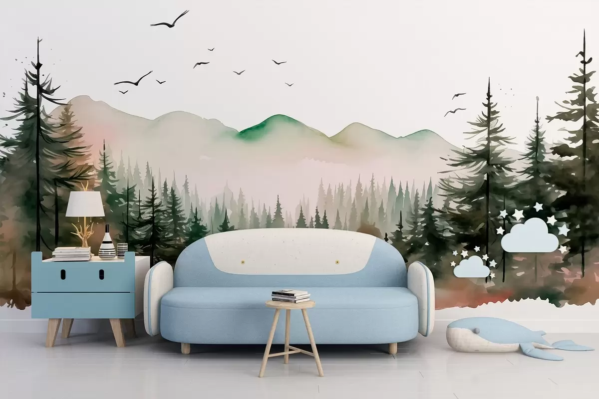 Fototapet Akvarell skogs- och bergslandskap, gröna och rosa färger  w02150v1