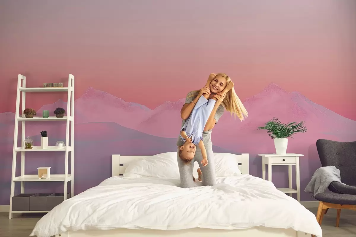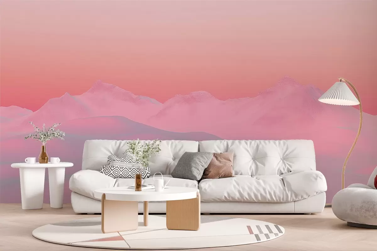 Fototapet Mjuk hallonfärgad solnedgång mot bakgrund av berg och himmel Nr. w02234