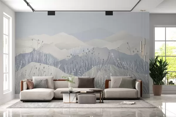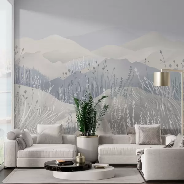 Fototapet Dimmiga berg och fält med gräs och blommor i blå toner Nr. w02317v1