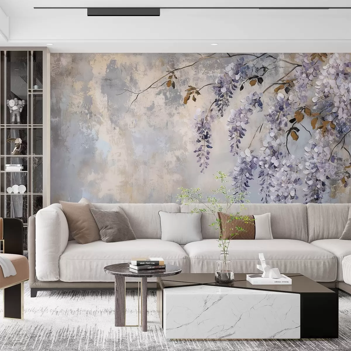 Fototapet strukturerad tapet i mjuka, dämpade färger med skira blåregnblommor och grenar. Nr. w02451