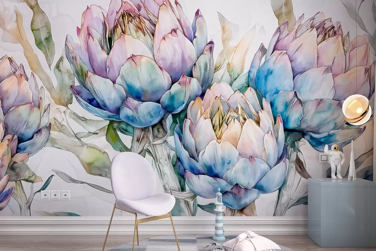 Fototapet Kronärtskockor teckning, akvarellstil, blommig, lila, beige, grön Nr. w02484
