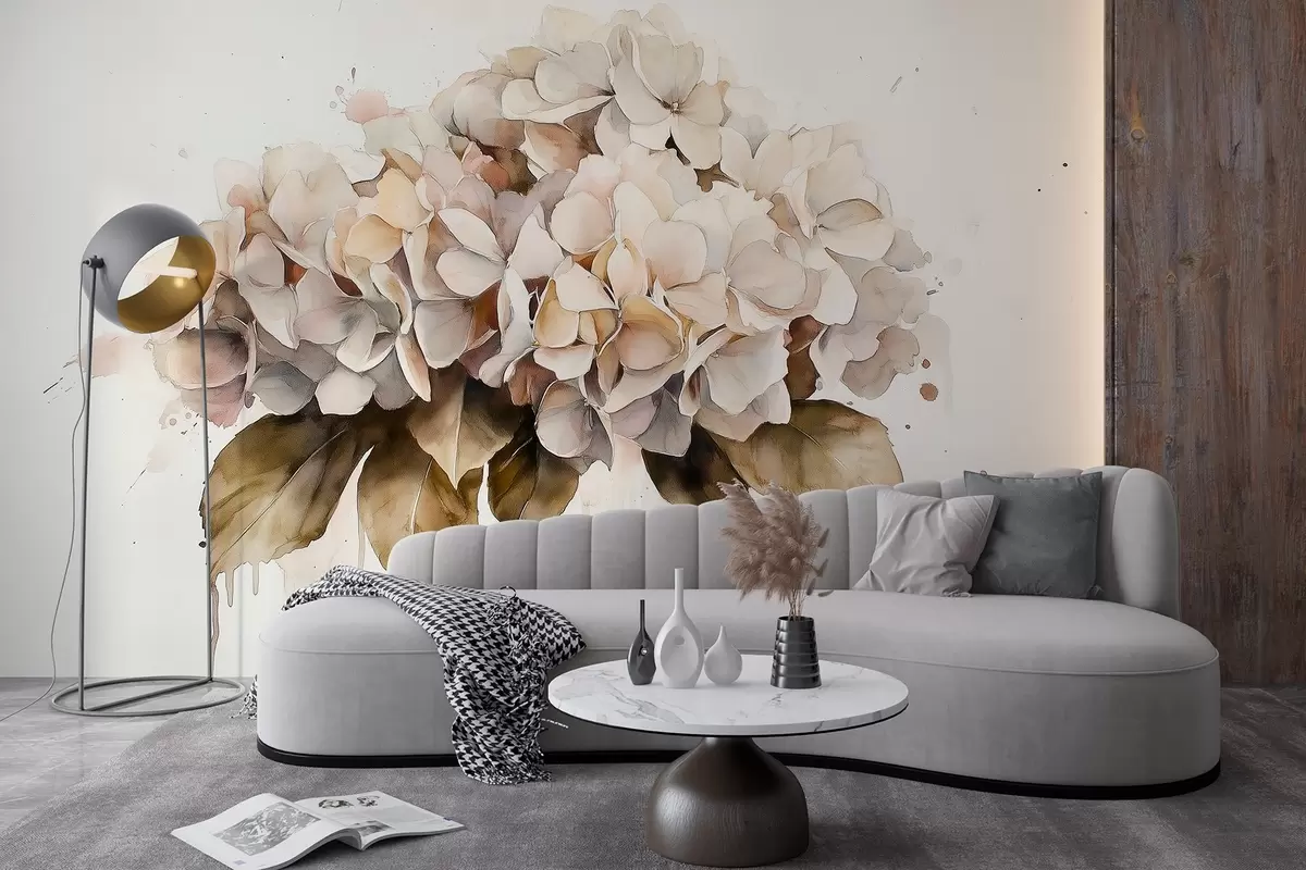 Fototapet Akvarellliknande teckning av hortensiablomma, beige färger Nr. w02485