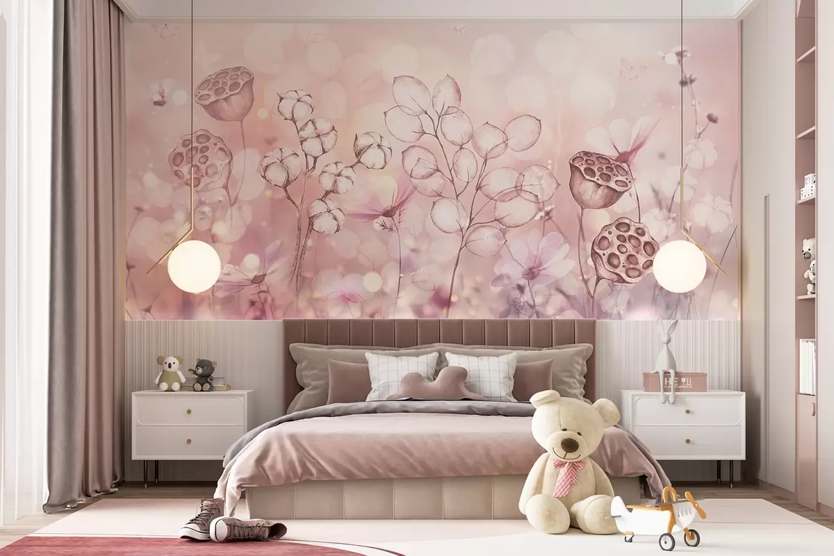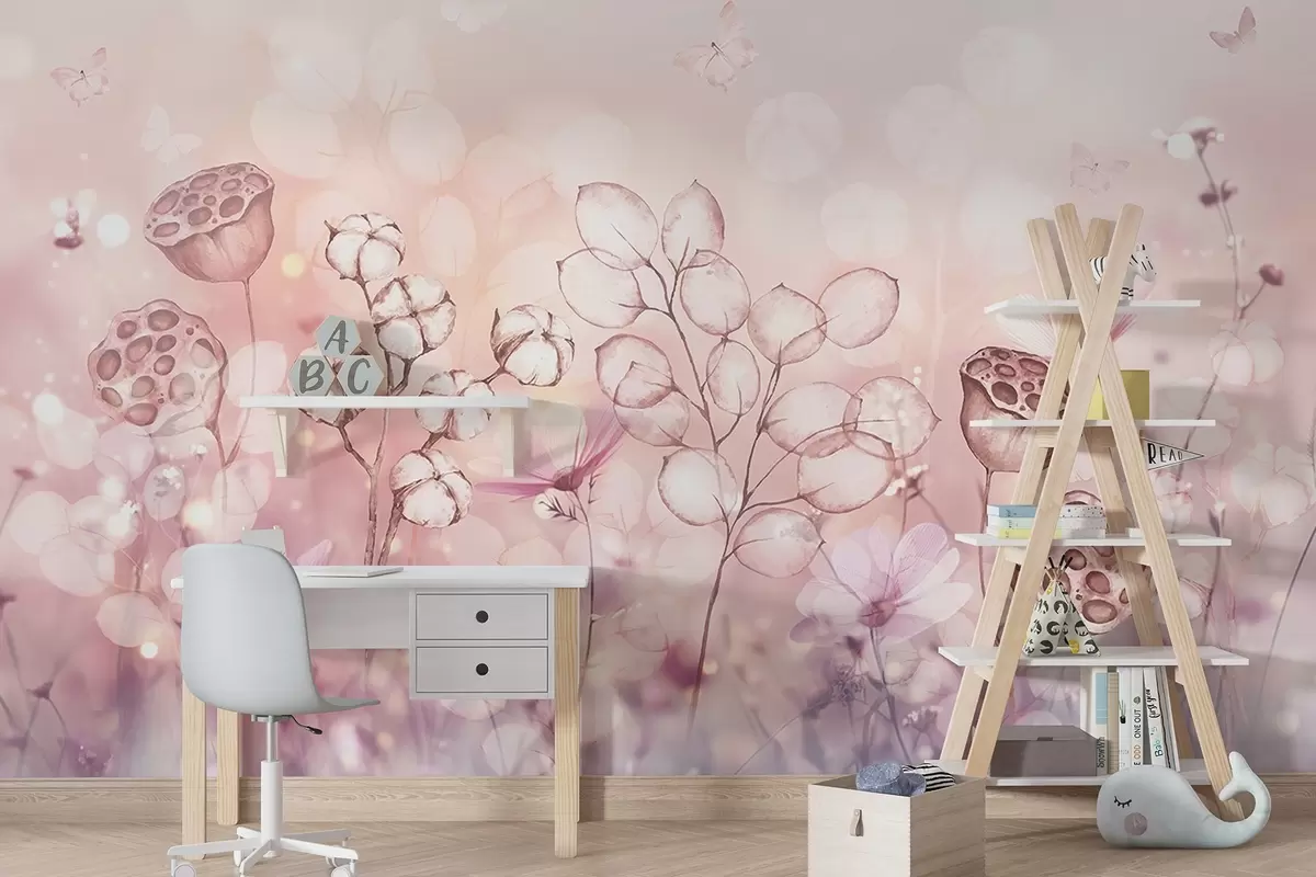 Fototapet Drömsk blomsterträdgård, fjäril, bomullsblommor, lotusblommor, rosa färger Nr. w02516