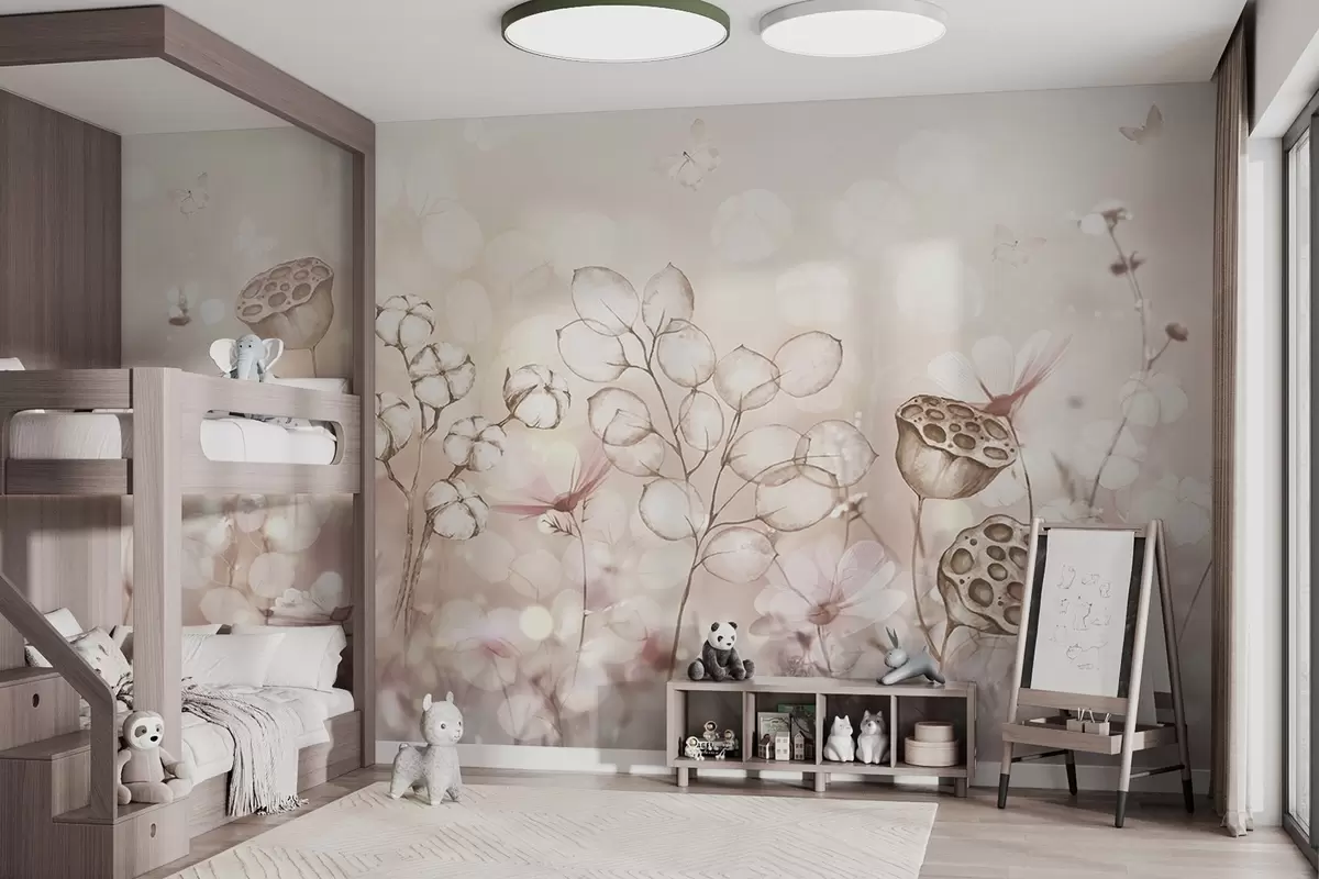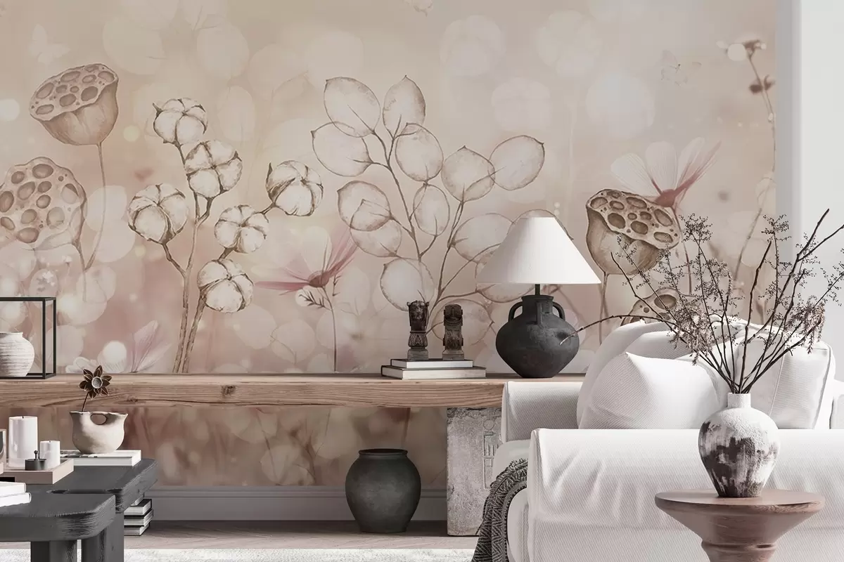 Fototapet Drömsk blomsterträdgård, fjäril, bomullsblommor, lotusblommor, beige färger Nr. w02516v3