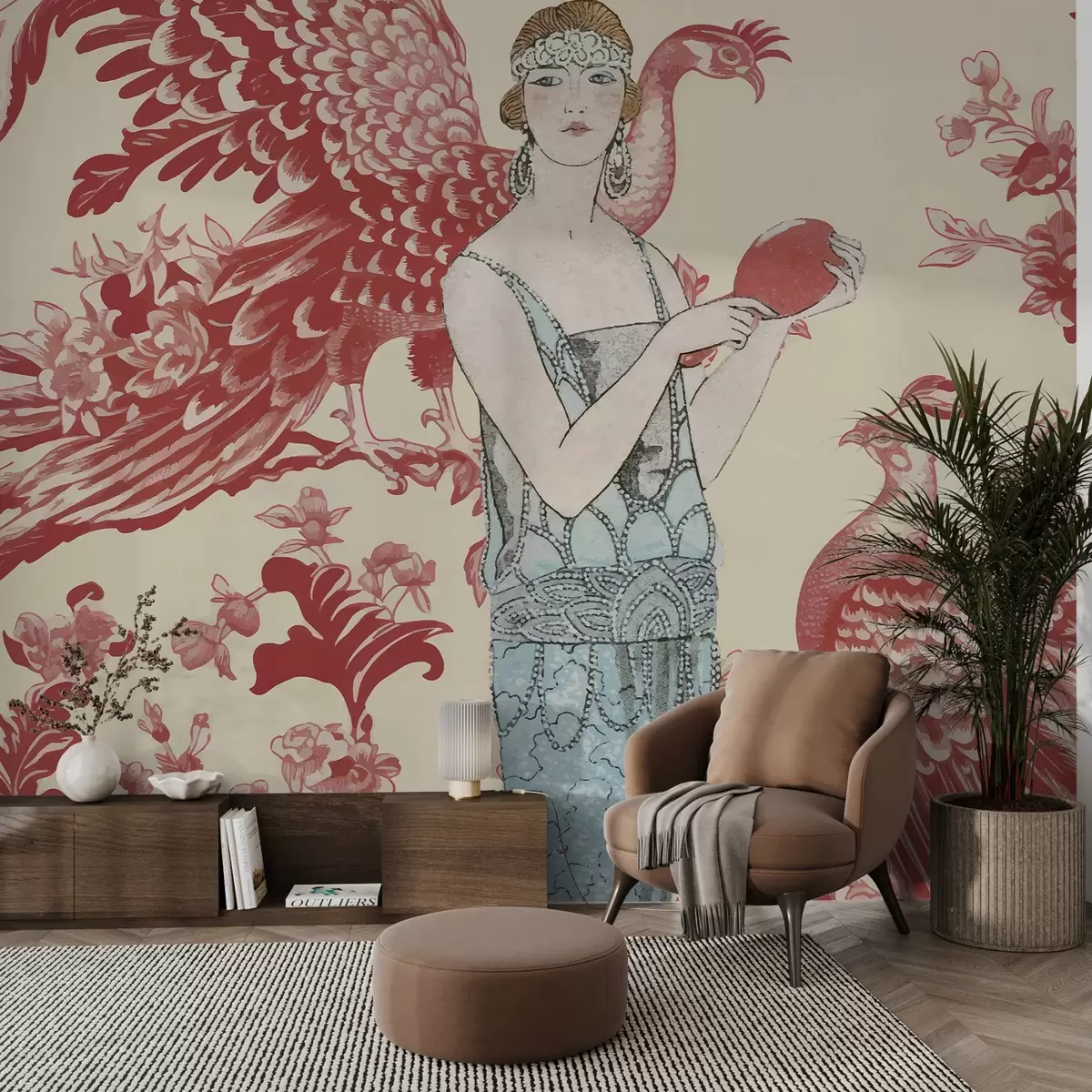 Fototapet Elegant blommönster i vintagestil med en kvinna i röda färger w02532v1
