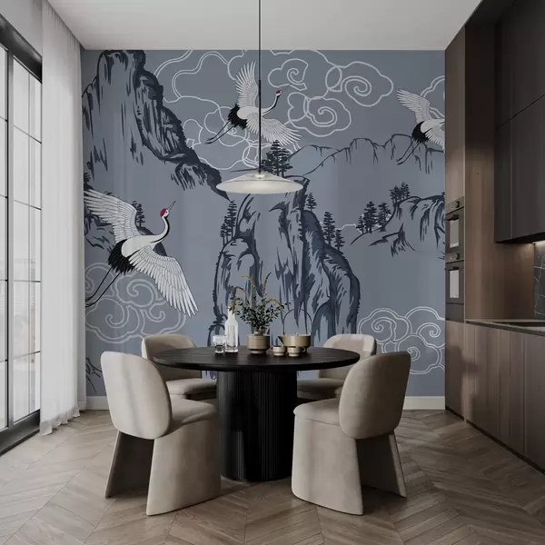 Fototapet Berg och tranor i japansk stil, i blå toner Nr. w02544