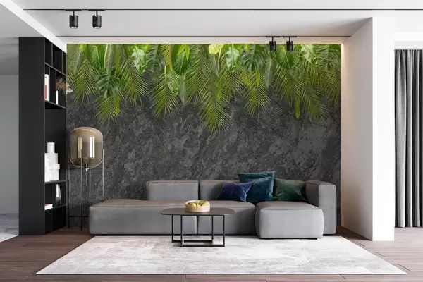 Fototapet tropiska blad på bakgrund av imiterad sten w02547