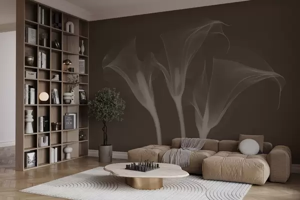 Fototapet luftiga transparenta Zantedeschia-blommor på en mörk bakgrund Nr. w02632v1