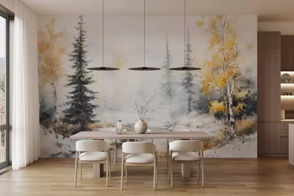 Fototapet Vinterskog, björkar, tallar, flod, dimma, pastellfärger Nr. w02742