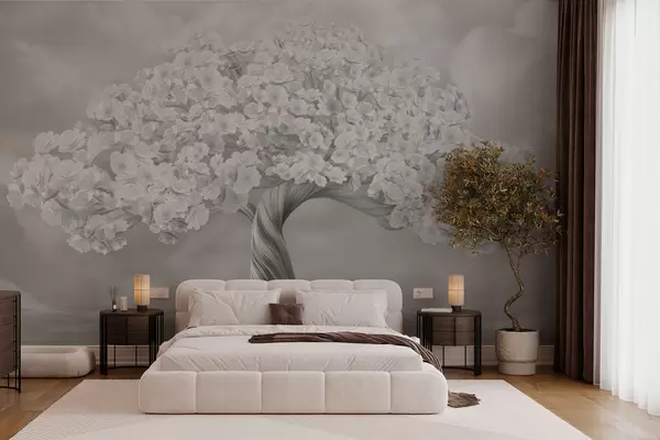 Fototapet Stort träd i blommor med moln i bakgrunden i pastellfärger w02748v1