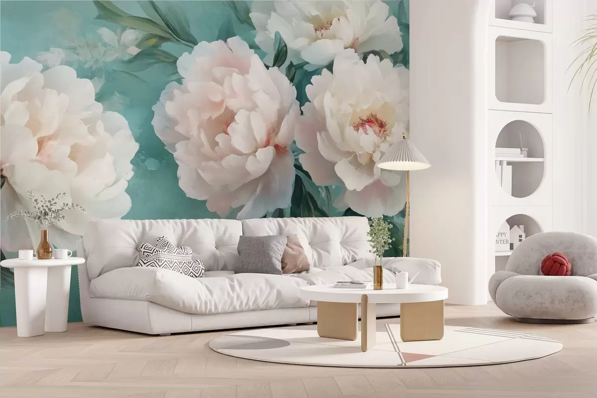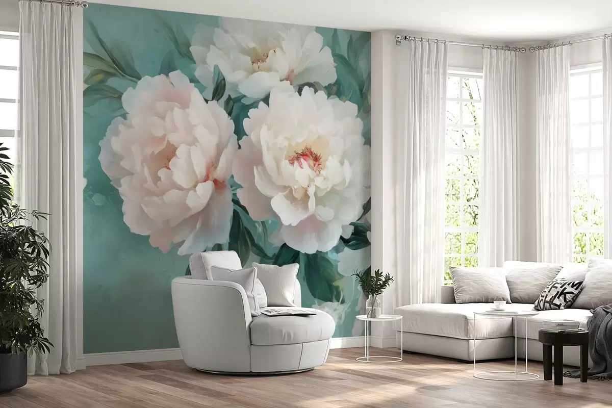 Fototapet stora blommor av frodiga pioner på en turkos bakgrund Nr. w02763