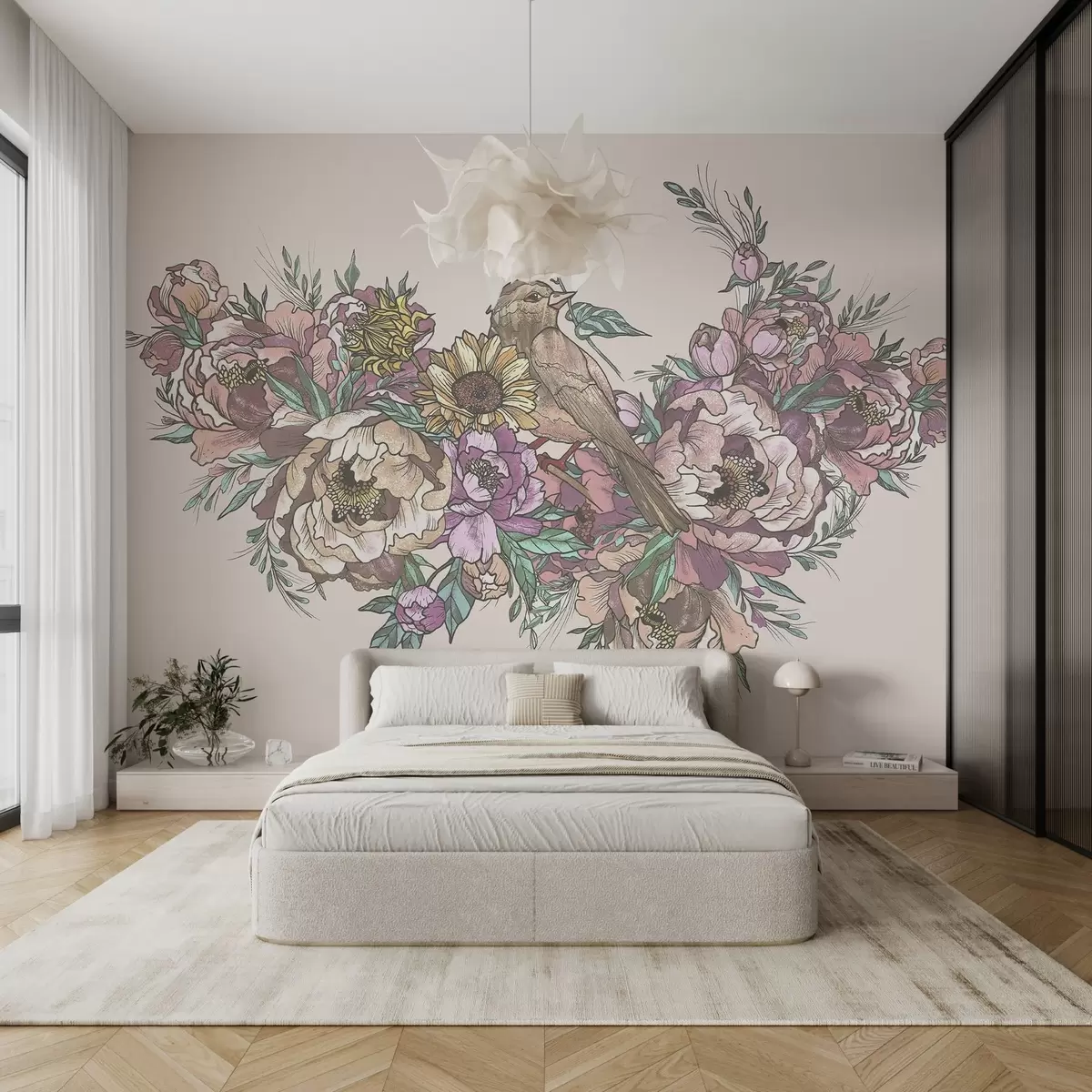 Fototapet Vintage illustration av fåglar och blommor Nr. w02833