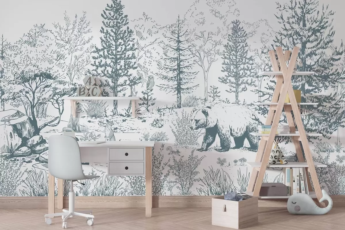 Fototapet Skogsliv, träd, vilda djur, björn, räv, uggla, buskar, blyertsteckning, blå färger Nr. w02929v1