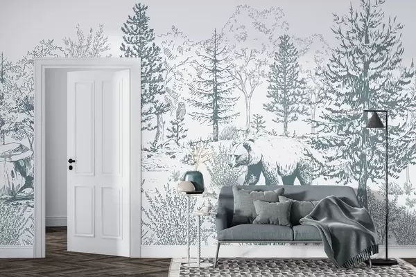 Fototapet Skogsliv, träd, vilda djur, björn, räv, uggla, buskar, blyertsteckning, blå färger Nr. w02929v1