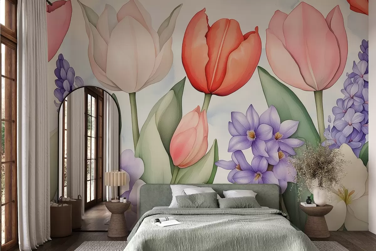 Fototapet Vårblommor, tulpaner, hyacint, akvarellstil teckning, blommig Nr. w02940