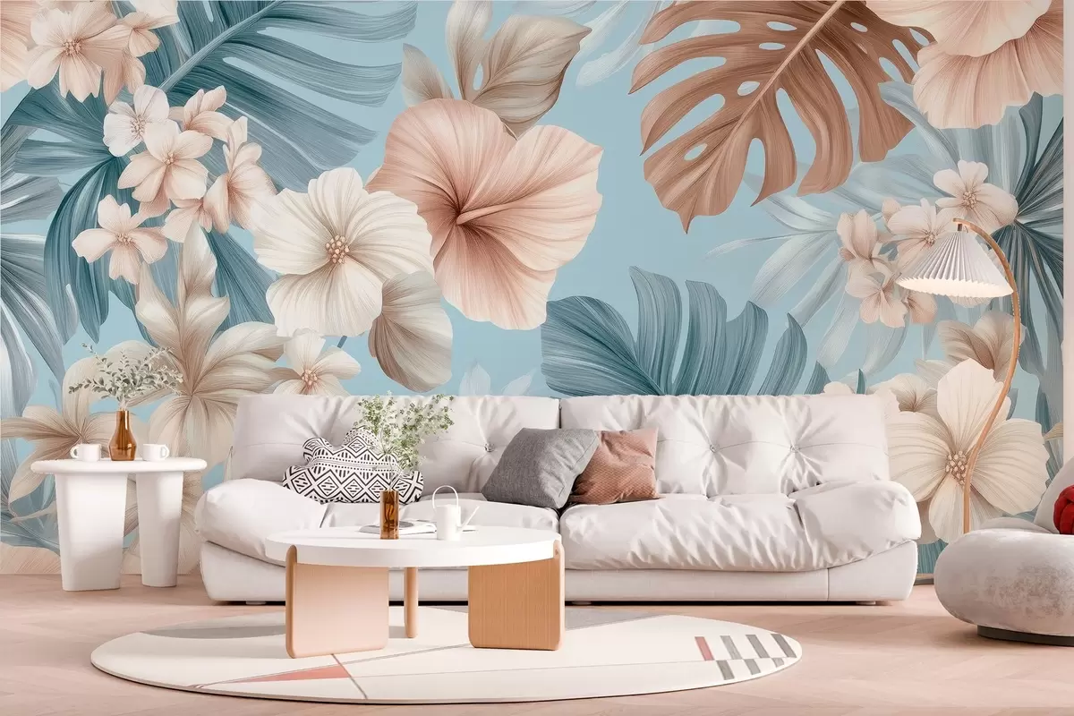 Fototapet tropiskt tryck med stora blad och blommor i pastellblå och beige färger Nr. w03013