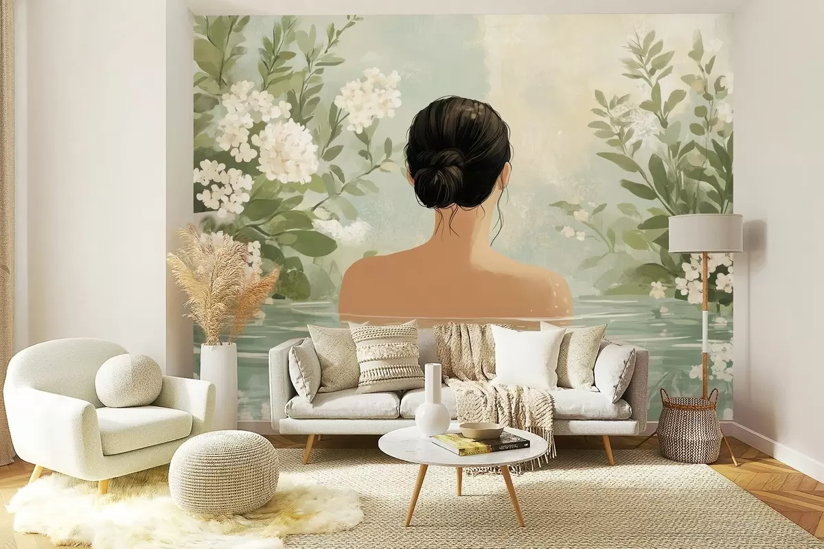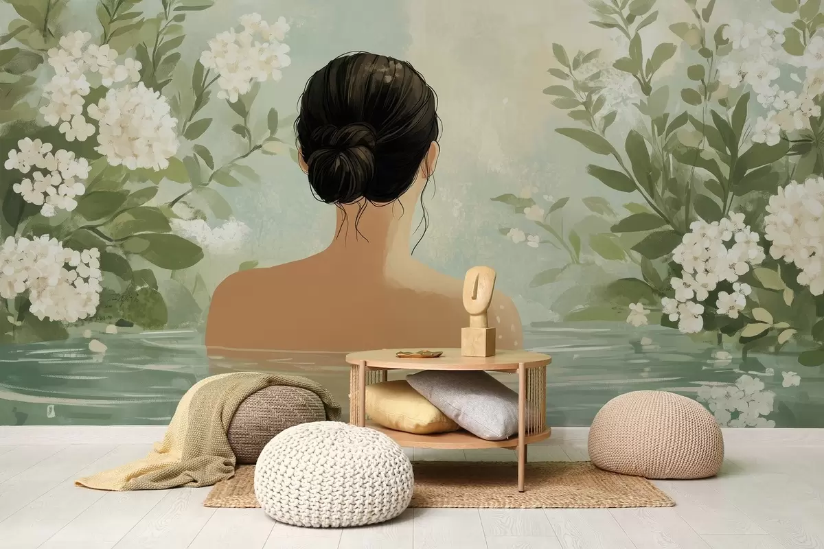 Fototapet en fridfull och drömsk botanisk illustration av en kvinna som badar i en lugn, reflekterande vattensamling, omgiven av frodig grönska och skira vita blommor. w03014