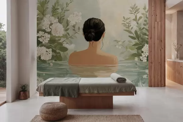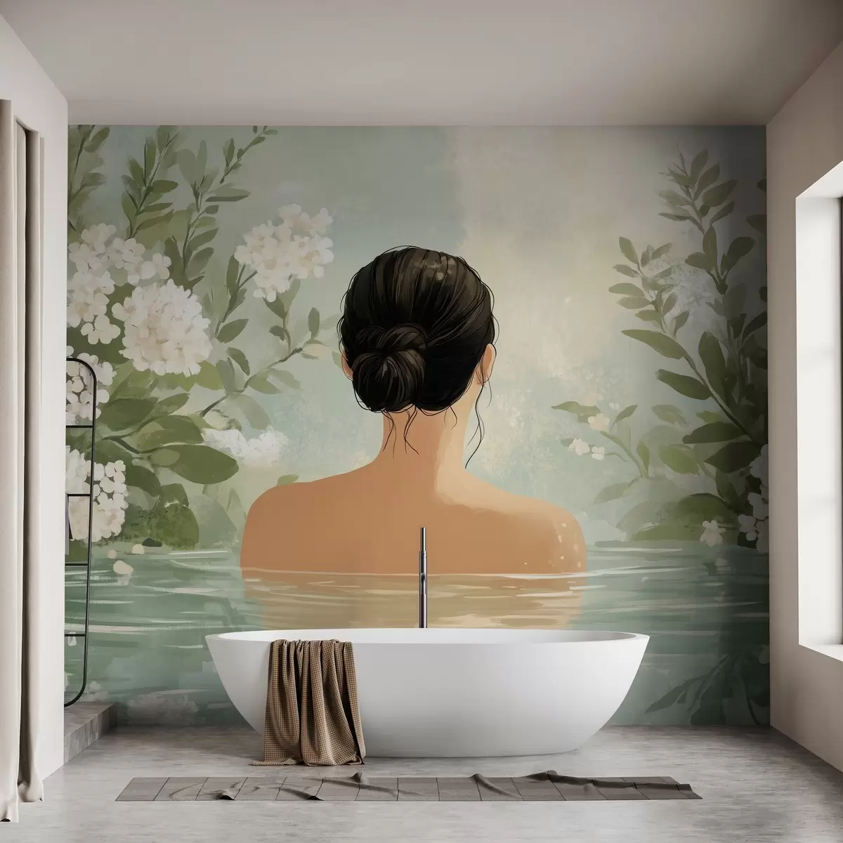 Fototapet en fridfull och drömsk botanisk illustration av en kvinna som badar i en lugn, reflekterande vattensamling, omgiven av frodig grönska och skira vita blommor. Nr. w03014