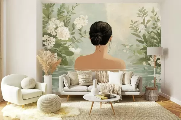 Fototapet en fridfull och drömsk botanisk illustration av en kvinna som badar i en lugn, reflekterande vattensamling, omgiven av frodig grönska och skira vita blommor. Nr. w03014