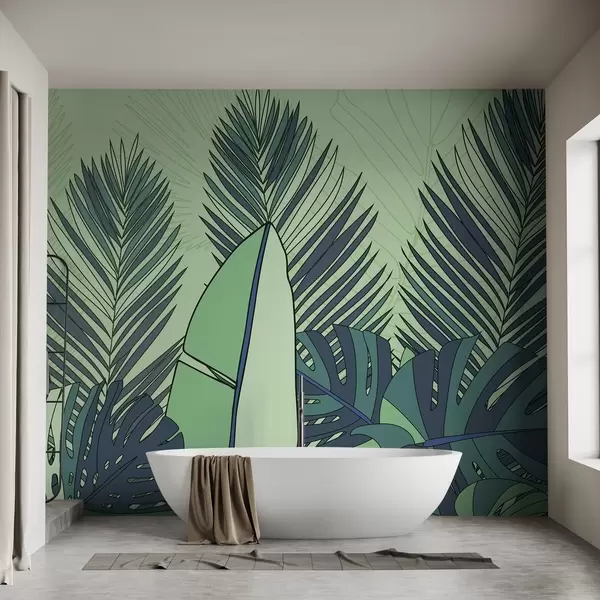 Fototapet Tropisk illustration med stora bananblad och palmblad i gröna nyanser Nr. w03085