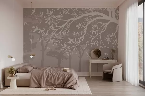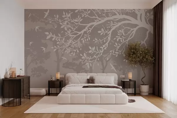Fototapet silhuett av en krämig trädgren med fåglar, på bakgrunden av skogen Nr. w03116