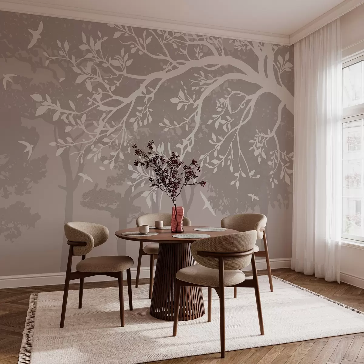 Fototapet silhuett av en krämig trädgren med fåglar, på bakgrunden av skogen Nr. w03116
