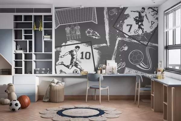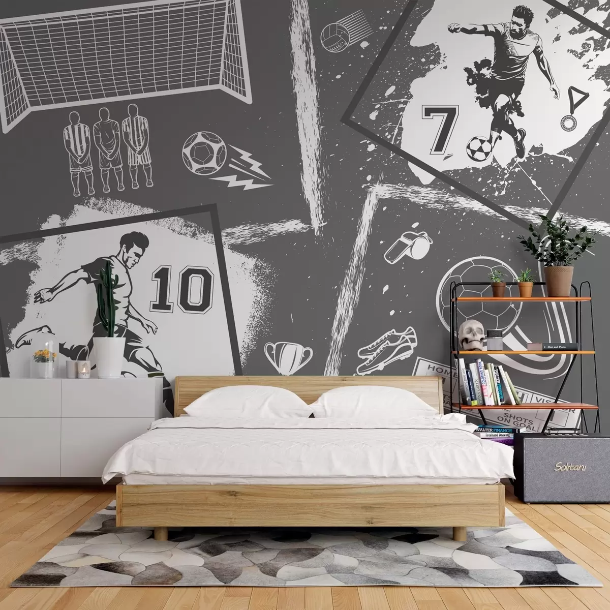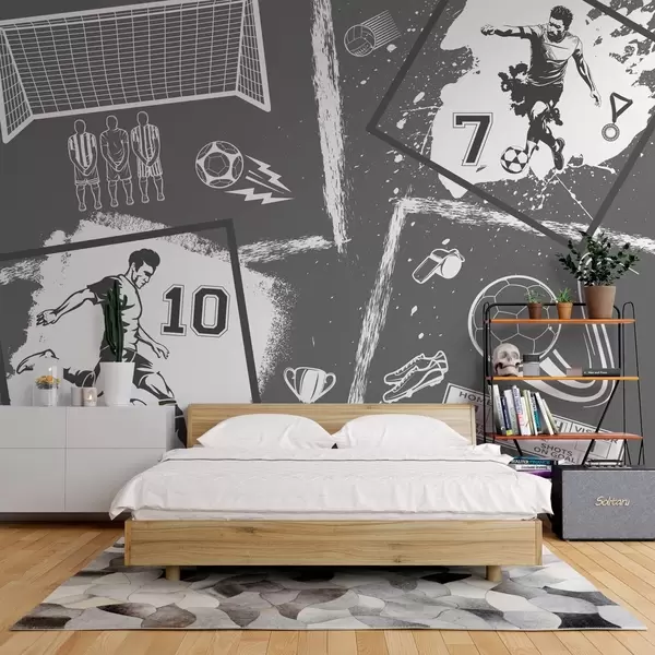 Fototapet Fotbollsspelare, boll och andra fotbollsattribut i gråtoner Nr. w03122v1