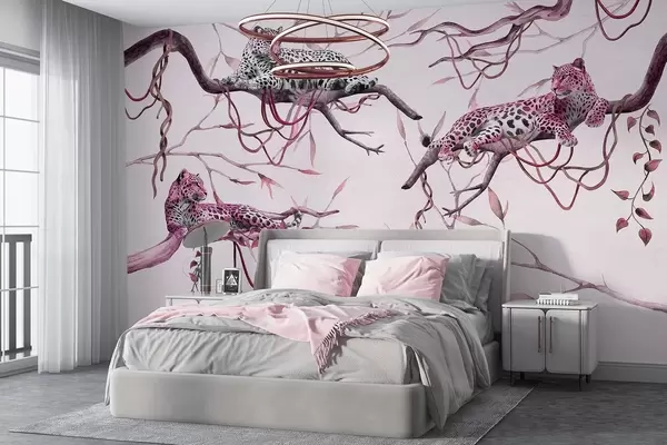 Fototapet Leoparder på djungelträden, lianer, tropiska, vilda djur, rosa färgpalett Nr. w03146v2