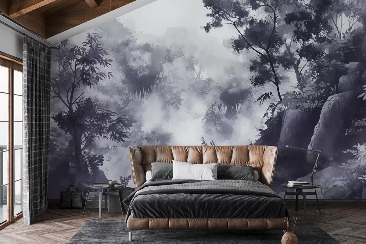 Fototapet Orientaliskt landskap, djungel, träd, akvarellstil, grå färger Nr. w03149v1