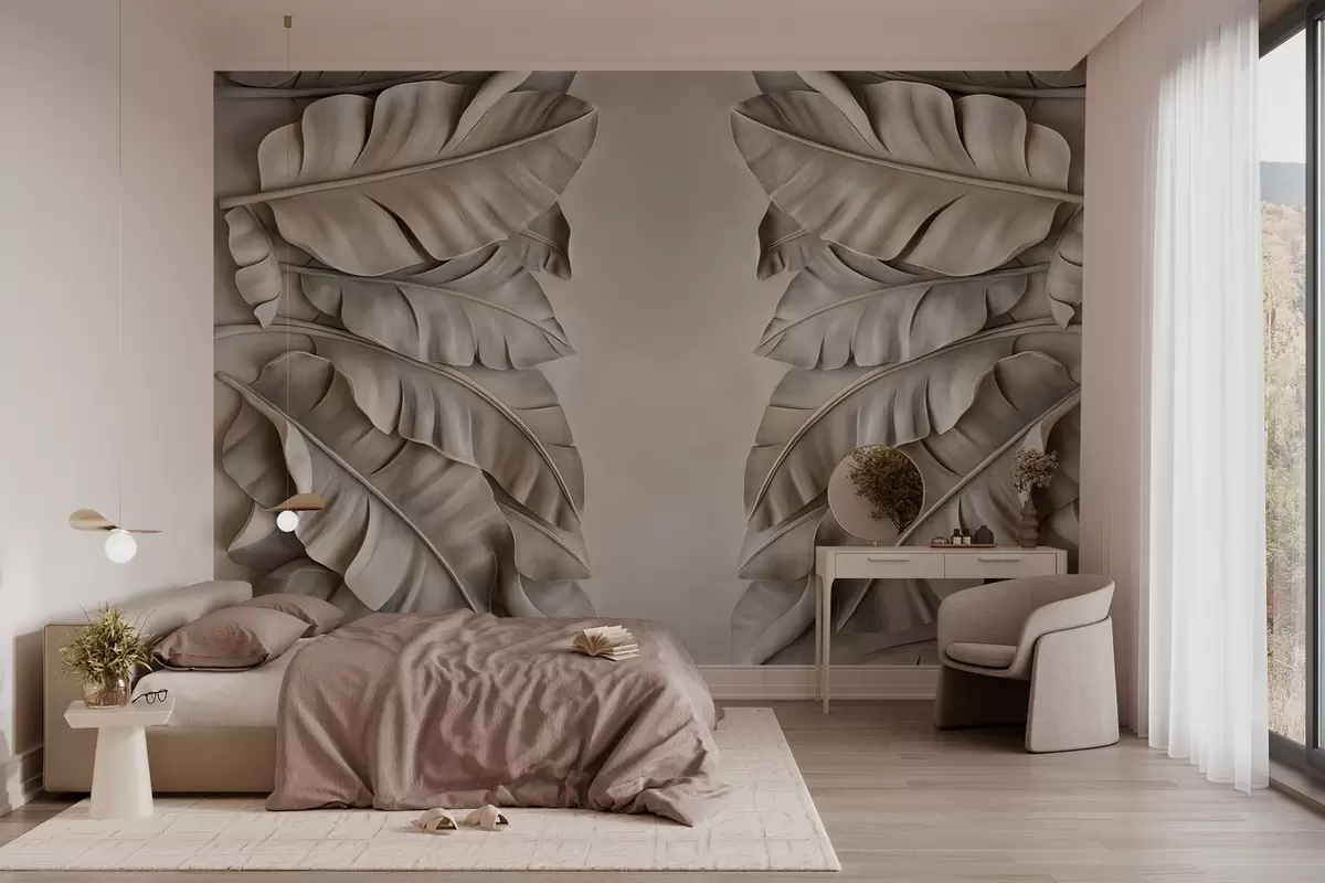 Fototapet imitation av en basrelief med tropiska blad i beige toner Nr. w03285