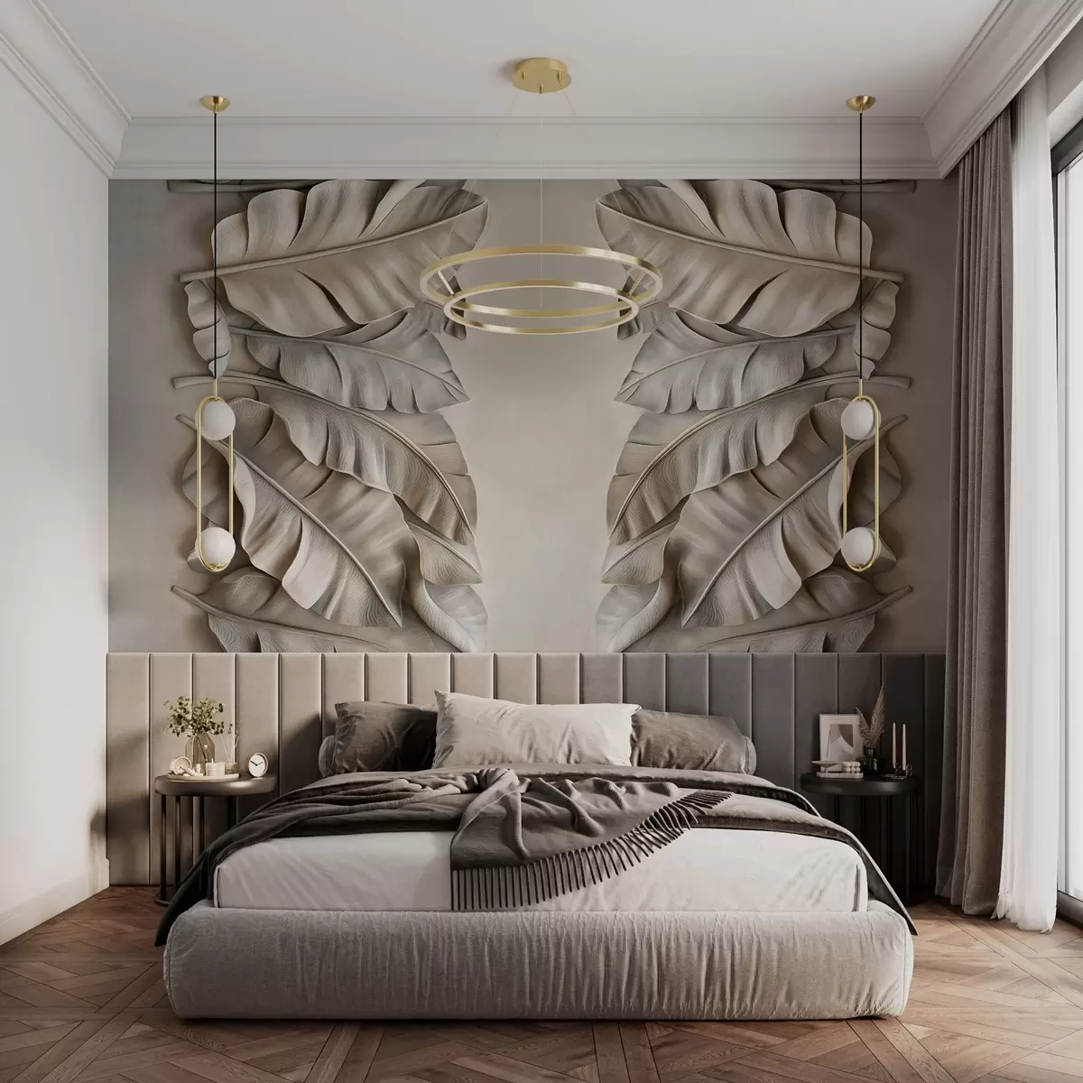 Fototapet imitation av en basrelief med tropiska blad i beige toner Nr. w03285