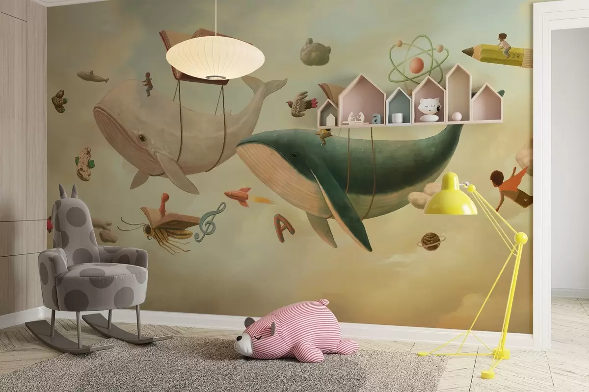 Fototapet En finurlig illustration av valar som flyger i skyn under bokformade ballonger Nr. w03327v1