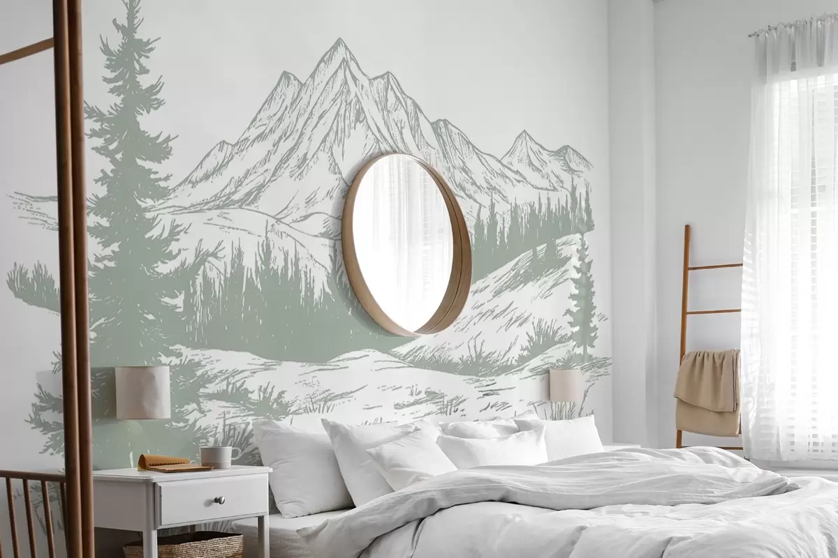 Fototapet Bergslandskap med tallar, skog, natur, mjuk grön färg Nr. w03344v1