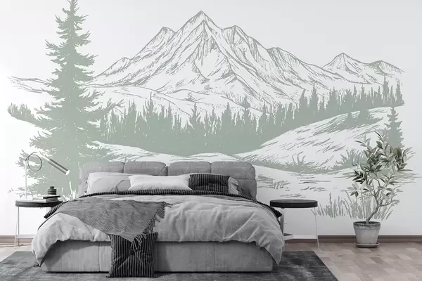 Fototapet Bergslandskap med tallar, skog, natur, mjuk grön färg Nr. w03344v1