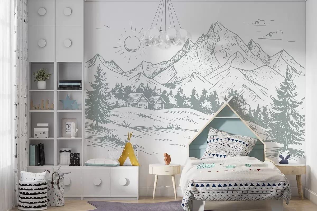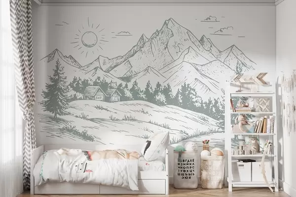 Fototapet Bergsteckning, naturlandskap, skog, trähus, mintfärg Nr. w03347v1
