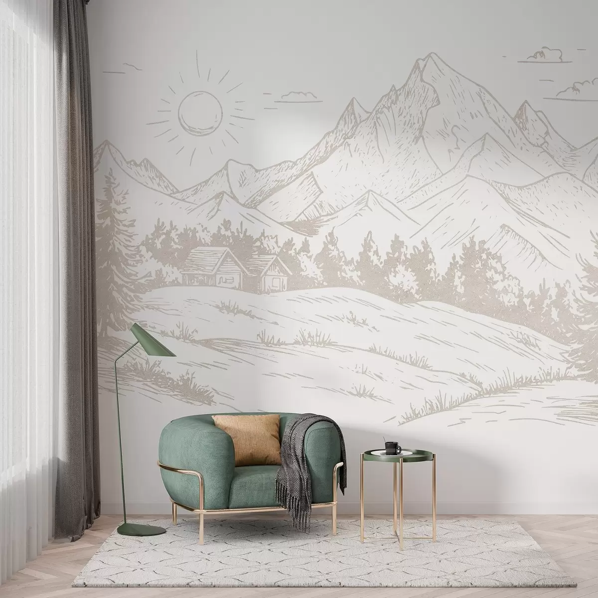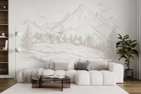 Fototapet Bergsteckning, naturlandskap, skog, trähus, beige färg Nr. w03348