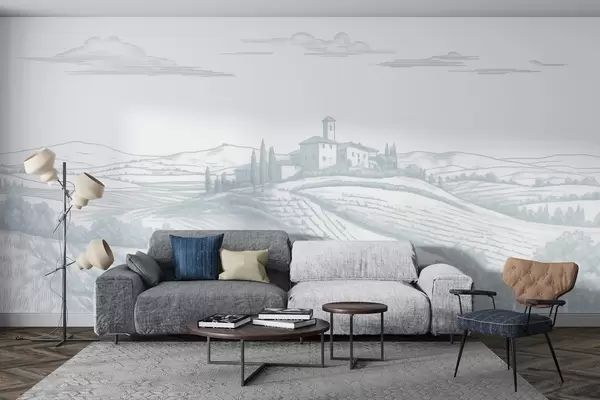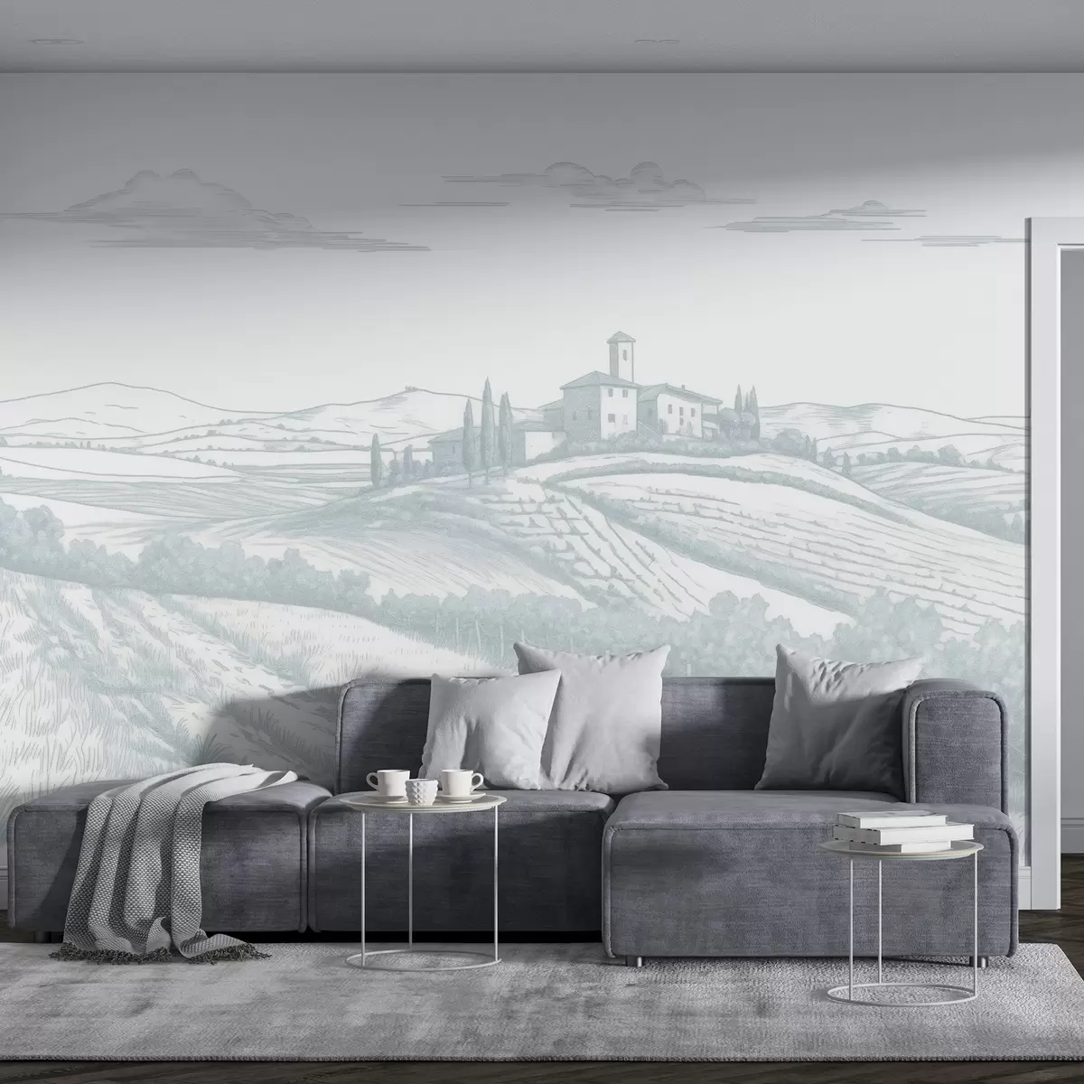 Fototapet Toscana landskap, Italien, vingårdar, natur, gammalt slott, blå färger Nr. w03349v1
