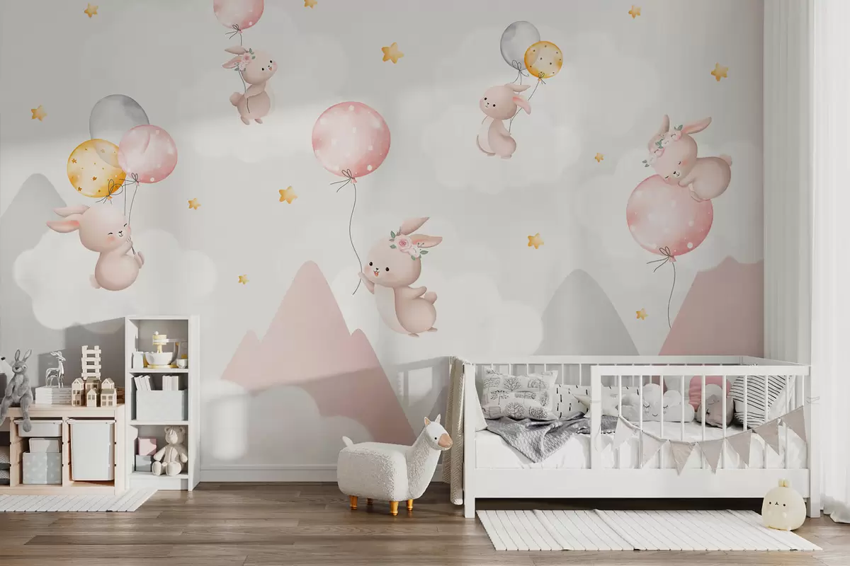 Fototapet Kaniner med ballonger på moln bland bergstoppar Nr. w03375