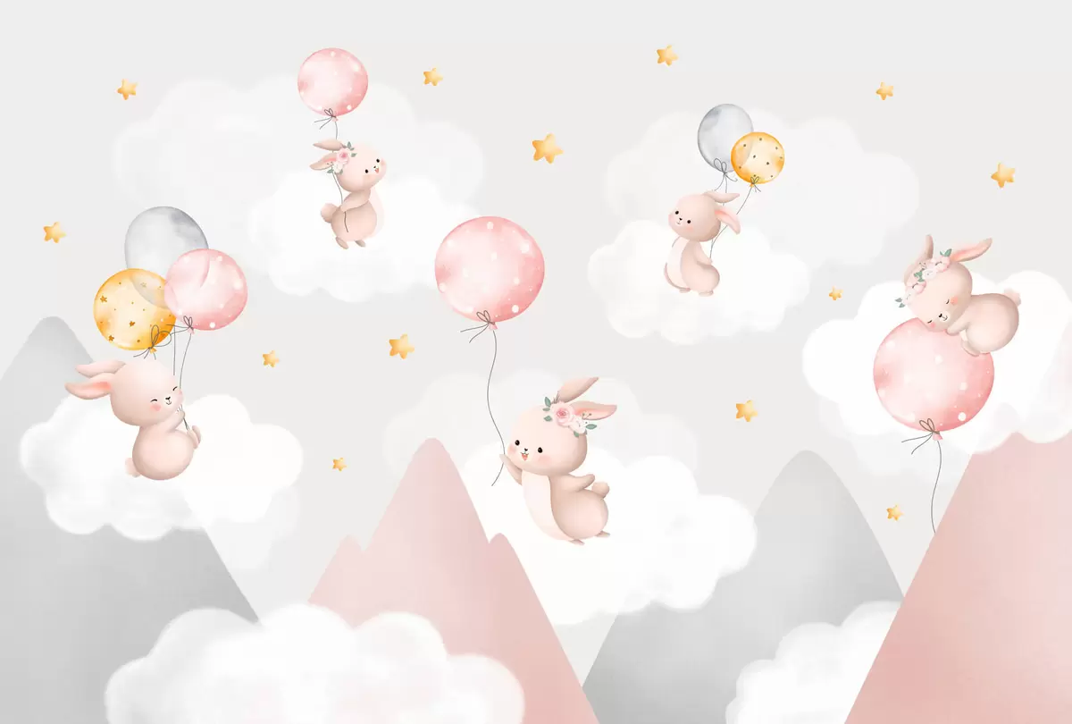 Fototapet Kaniner med ballonger på moln bland bergstoppar Nr. w03375