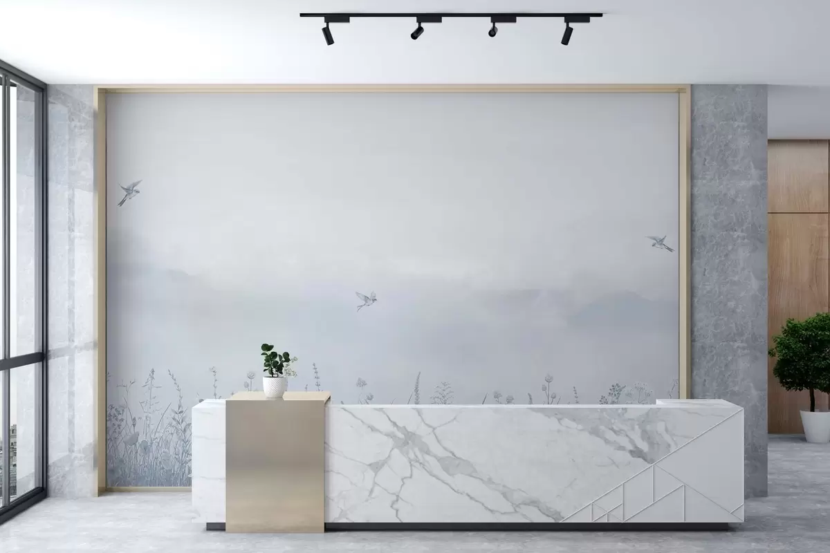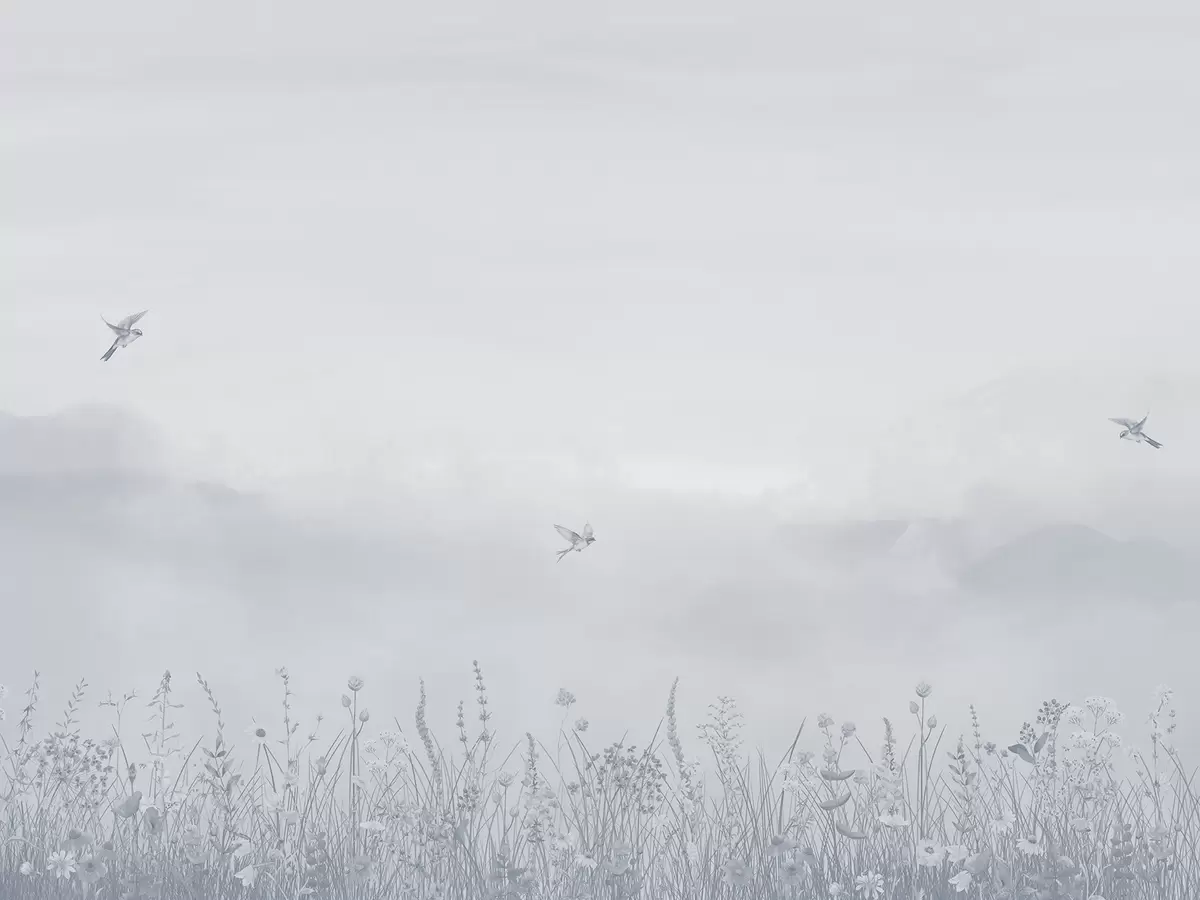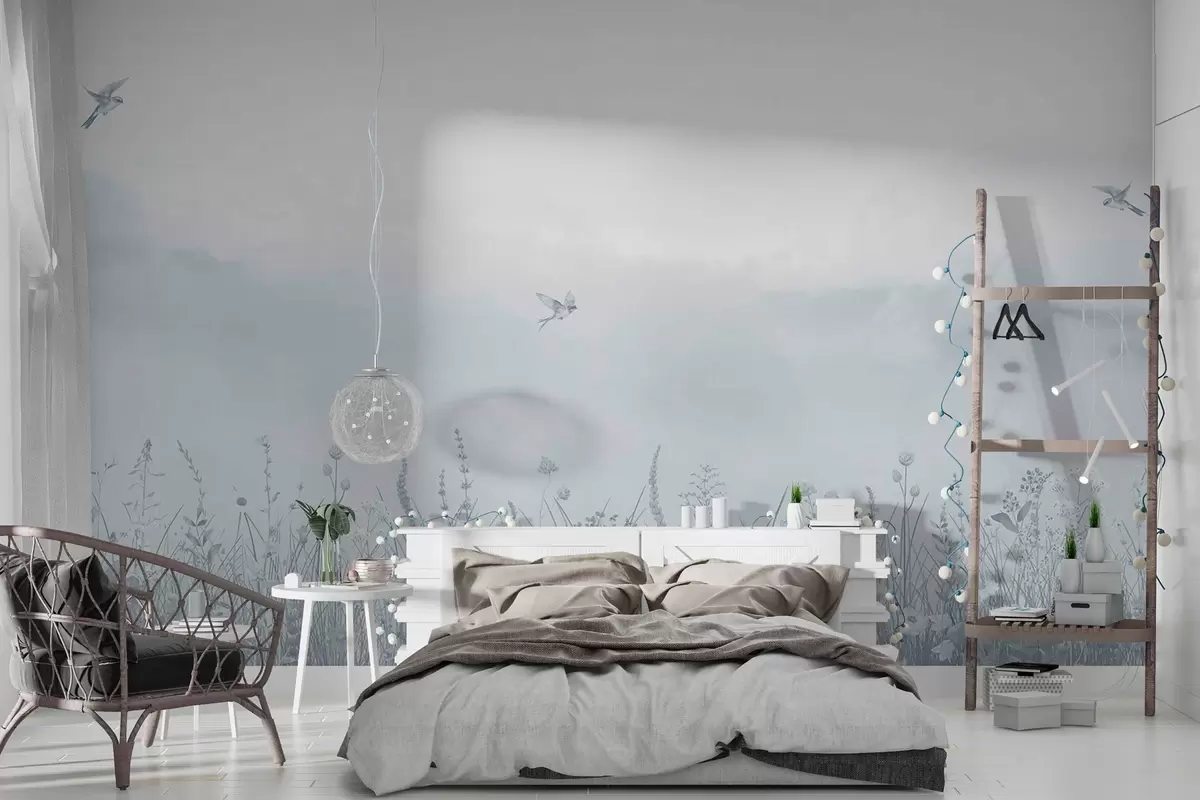 Fototapet Vilda blommor och disig himmel i blå toner Nr. w03391v1