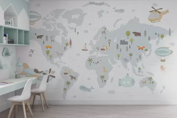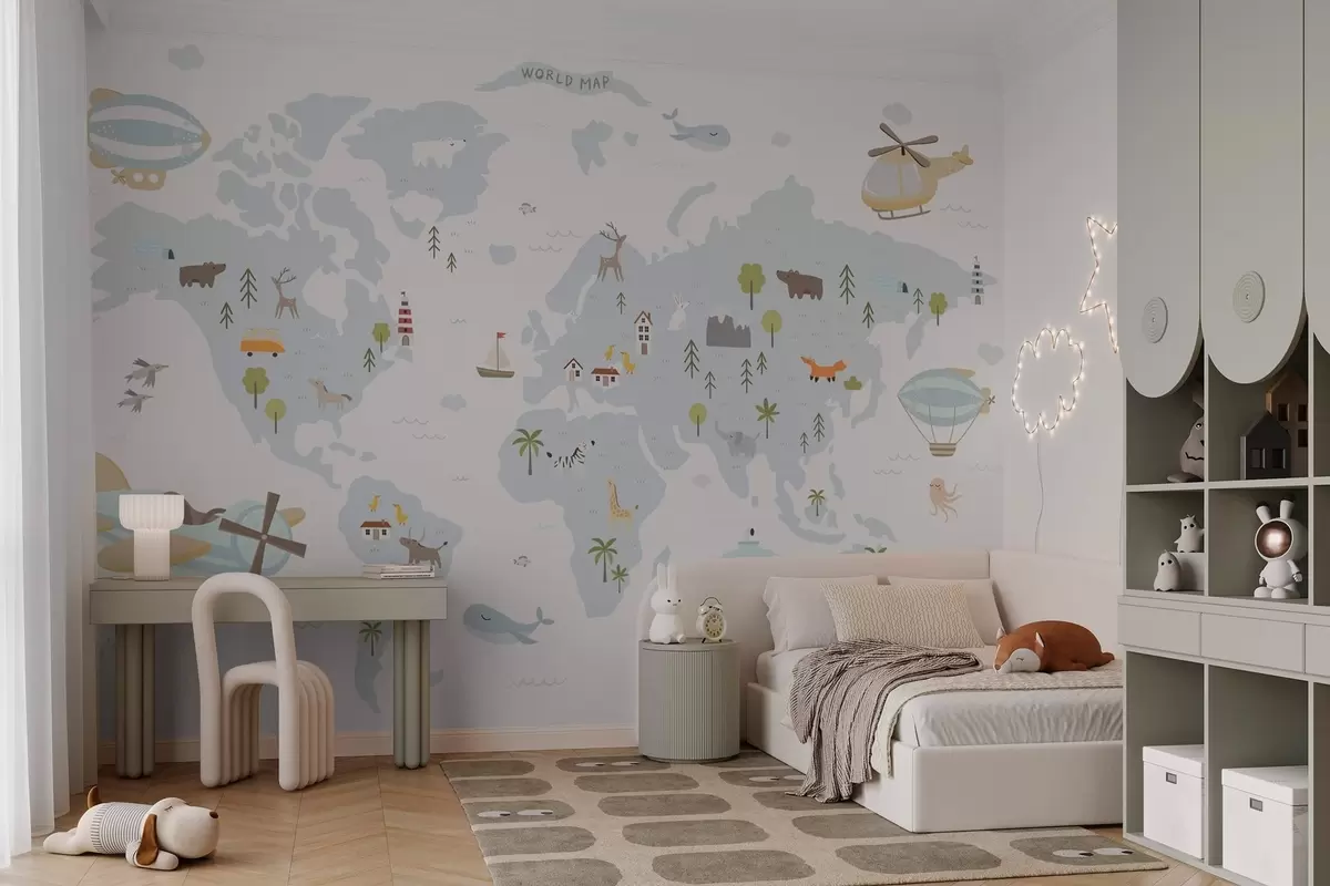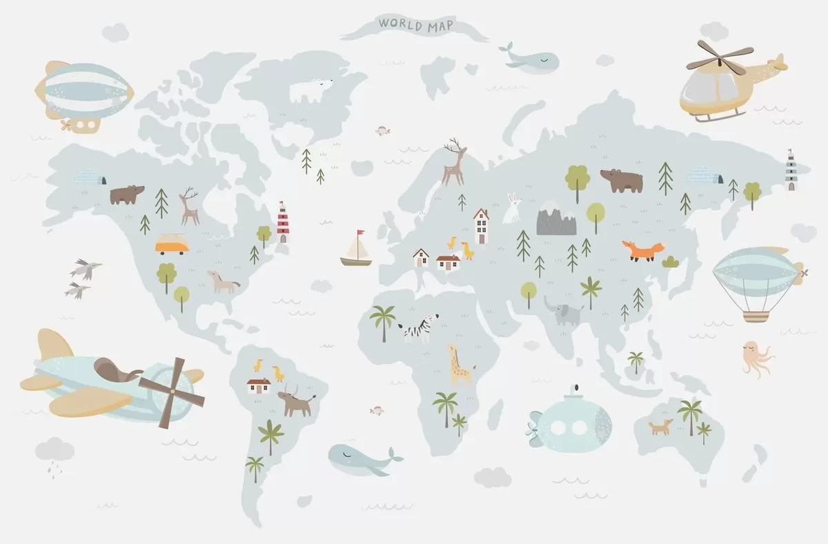 Fototapet Världskarta för barn med djur och flygplan Nr. w03392